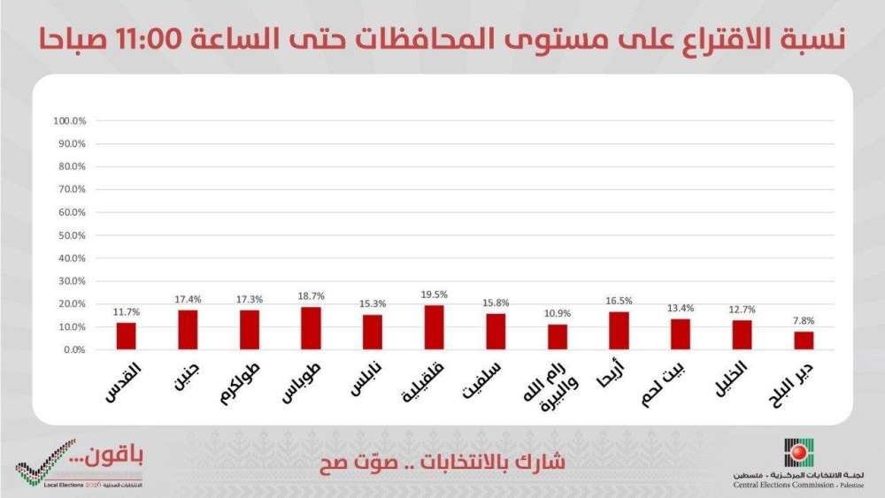 📌 نسبة الاقتراع في الانتخابات المحلية 2026 على مستوى محافظات الضفة الغربية وفي دير البلح وسط قطاع غزة حتى الساعة 11:00 صباحاً
